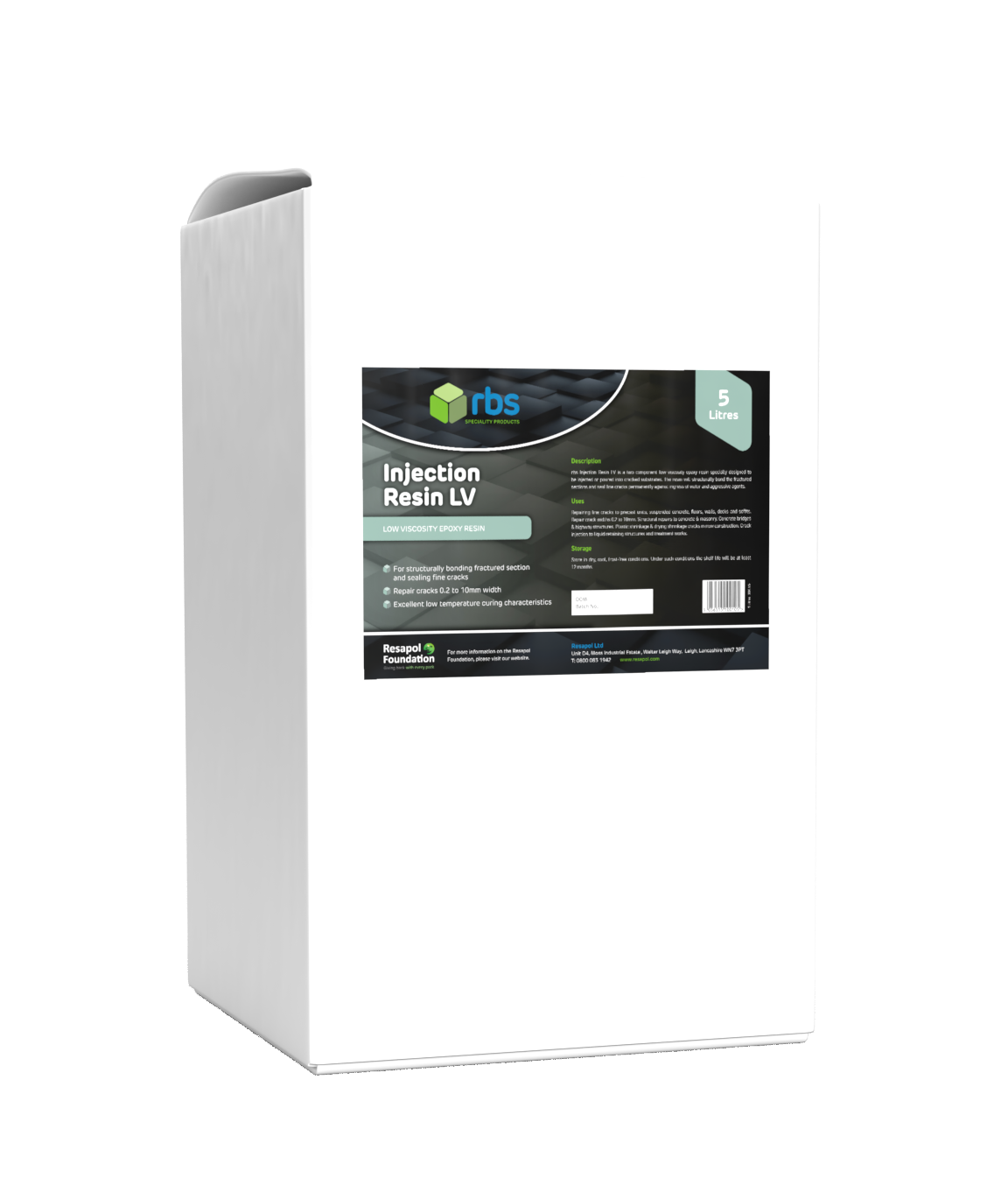 rbs Injection Resin LV is a two component low viscosity epoxy resin, specially designed to be injected or poured into cracked substrates. The resin will structurally bond the fractured sections and seal fine cracks permanently against ingress of water and aggressive agents. Complies with BS EN 1504-5.
